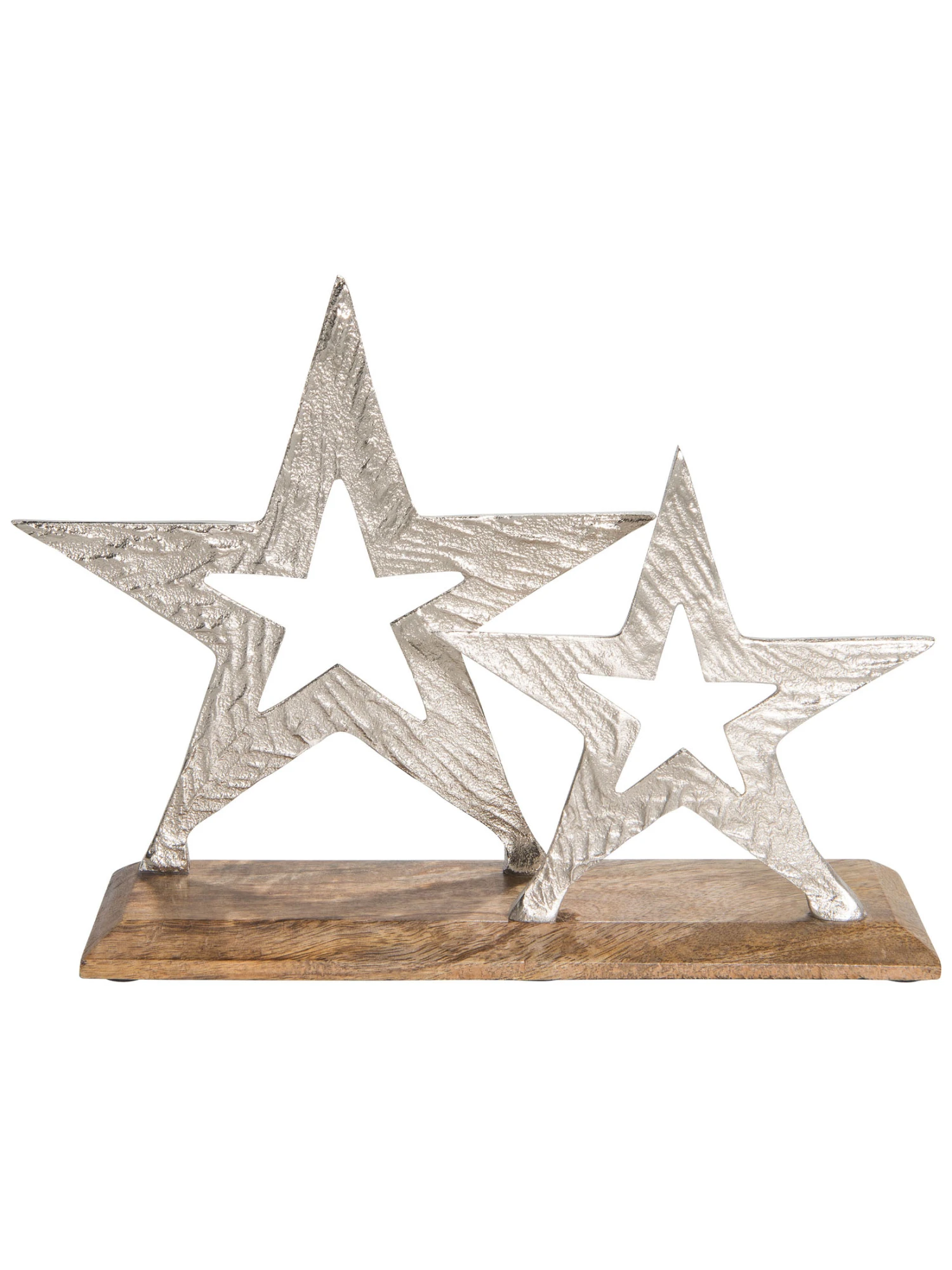 Weihnachtlicher Aufsteller mit Sternen aus Aluminium und Halter aus Holz.