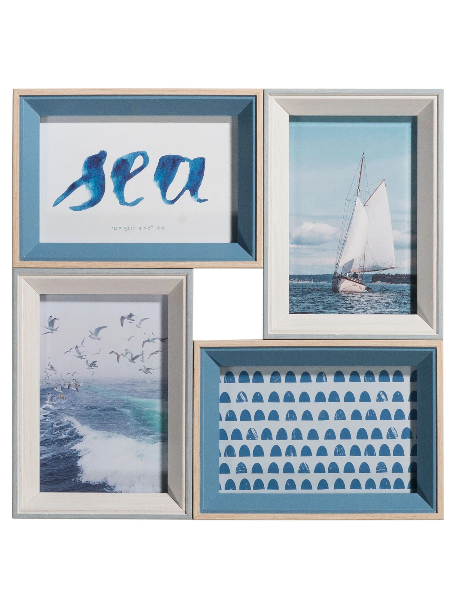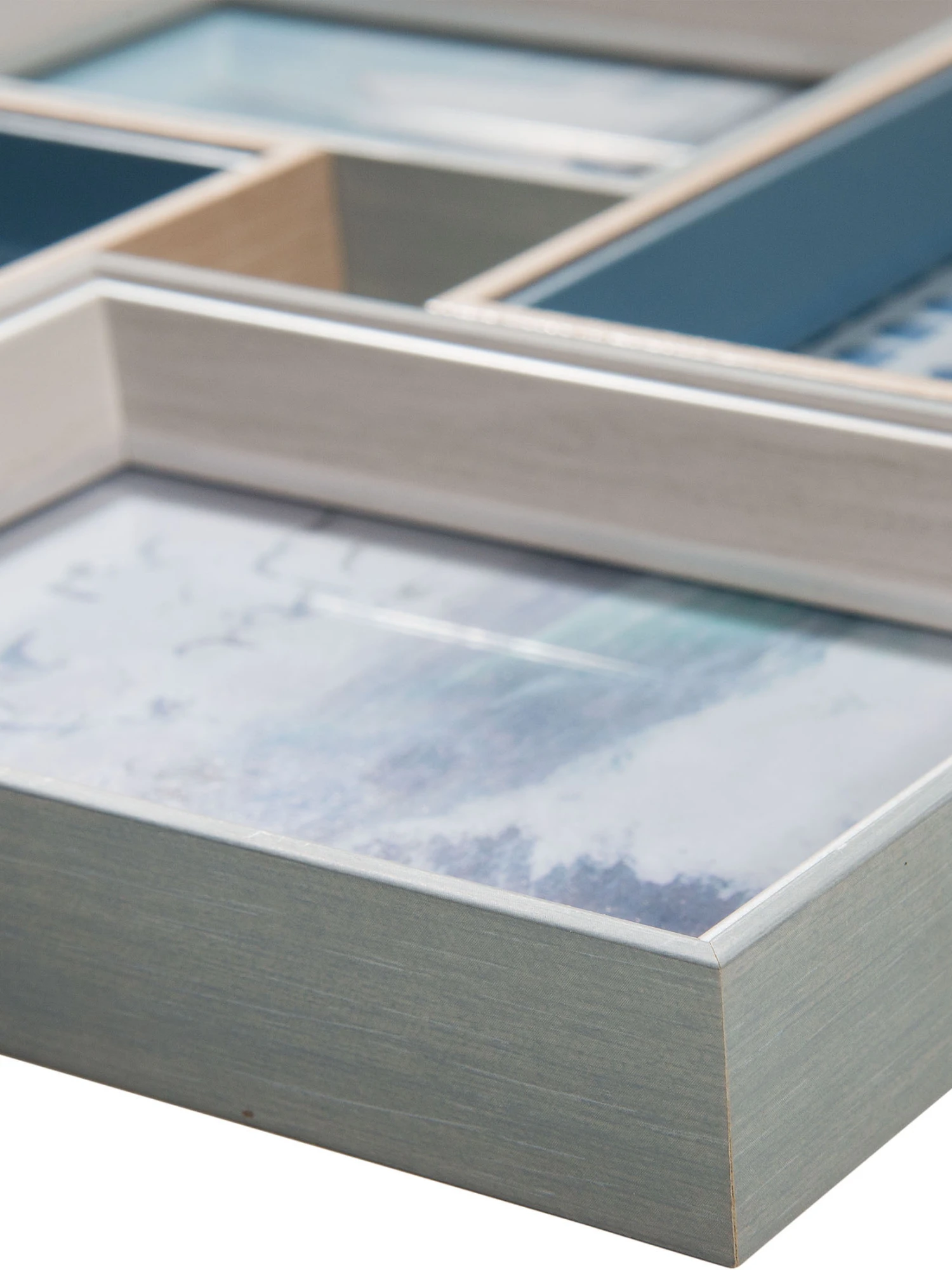 Collage aus verschiedenen Rahmen in kühlen Blautönen. Das moderne Design passt besonders zu einer maritimen Einrichtung.