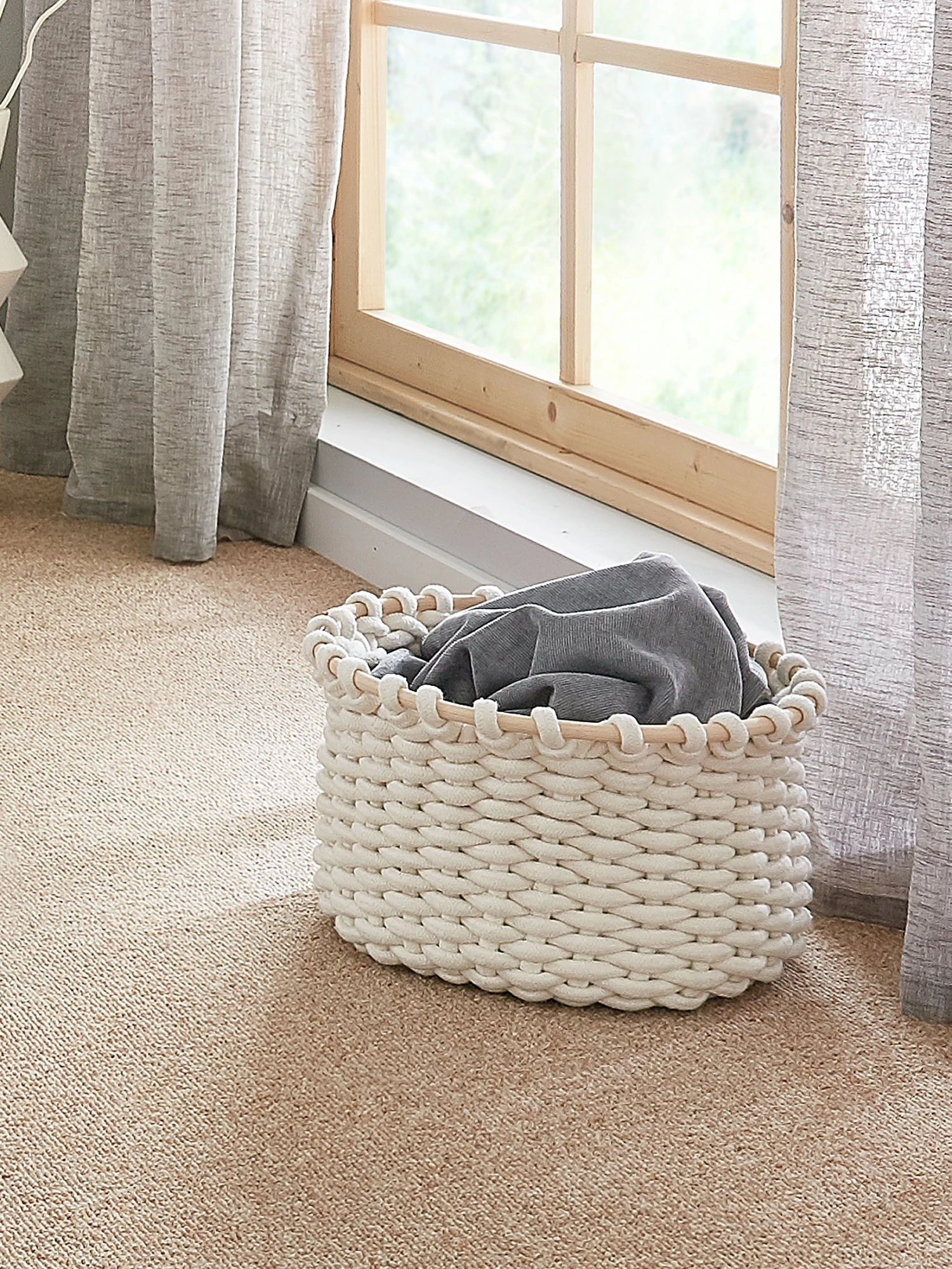 Attraktiver runder Korb. Kordel aus Baumwolle und Polyester wird über einen Rattanring geflochten.