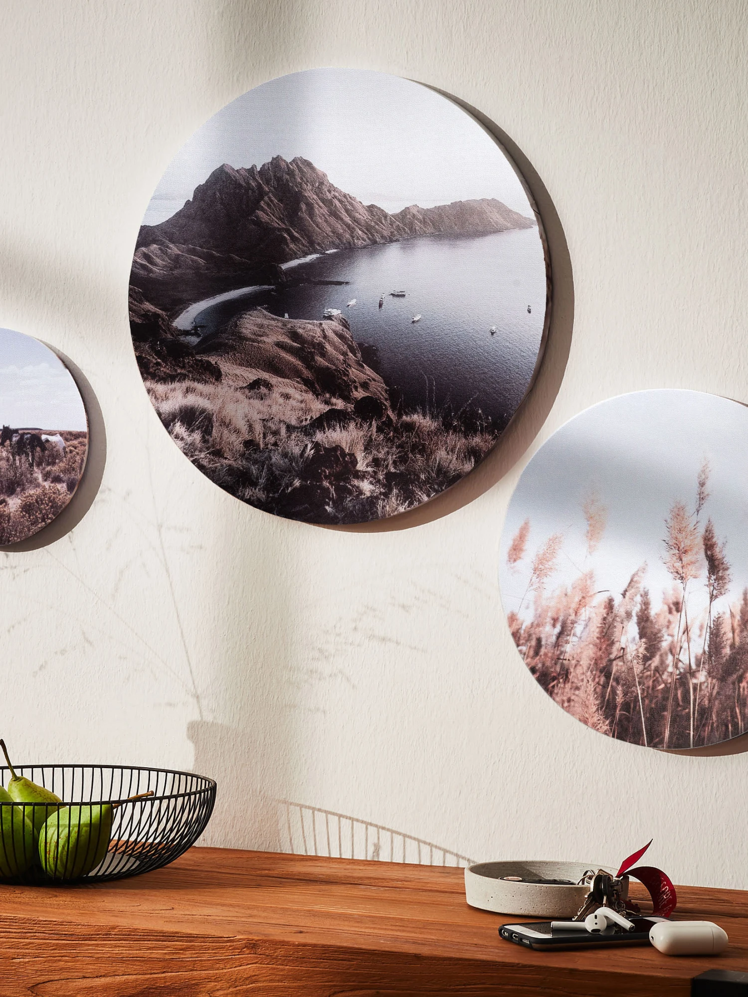 Kunstdruck-Serien auf Leinwand. Auf Holzrahmen gespannt. 3er Set bestehend aus den Größen ca. 20 cm Ø, ca. 30 cm Ø und ca. 40 cm Ø.