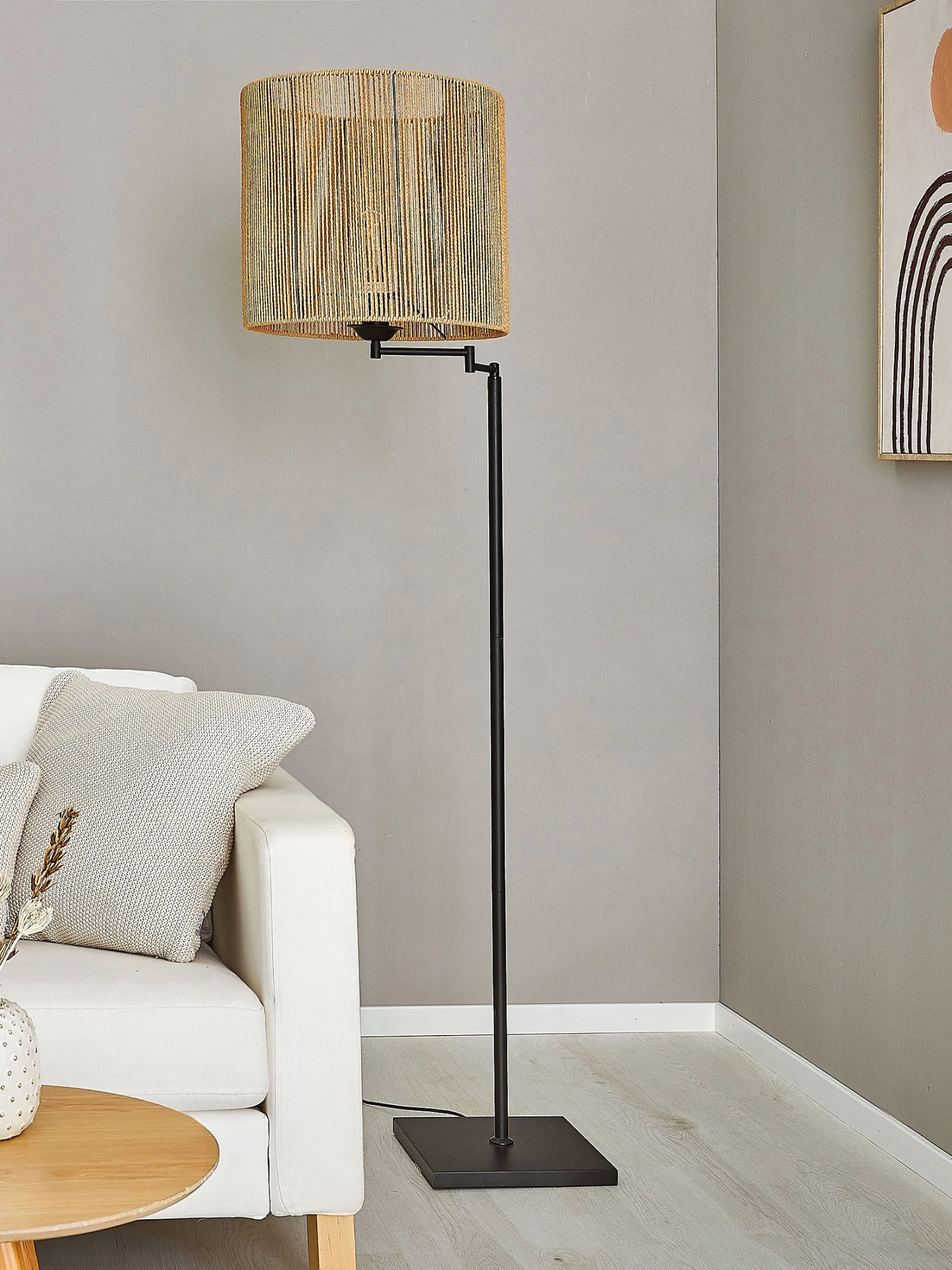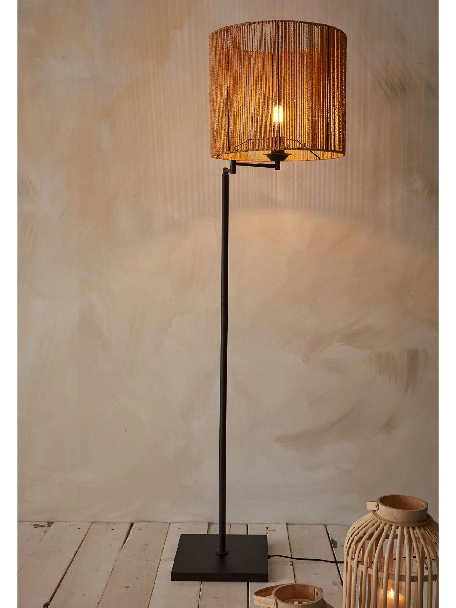 Bei DAITO wird der Metallrahmen mit Papierseil in Handarbeit umwickelt. Die Metallarme zum Lampenschirm sind beweglich. Der Metall-Standfuß ist kippsicher verstärkt. Exkl. Leuchtmittel E 27, 40 W. Der Lampenschirm hat einen Durchmesser von ca. 40 cm. Die Lampe hat eine Gesamthöhe von ca. 155 cm.