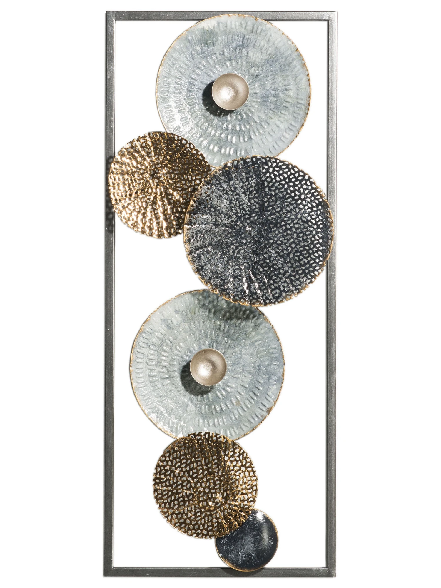 SEAFLOWERS ist ein besonderes Wandobjekt aus verschieden gestalteten Scheiben in unterschiedlicher Farbgebung, unterschiedlichen Strukturen und unterschiedlichen Größen. Aus Metall gefertigt. Größe: ca. 34,5 x 28,5 x 64,5 cm.